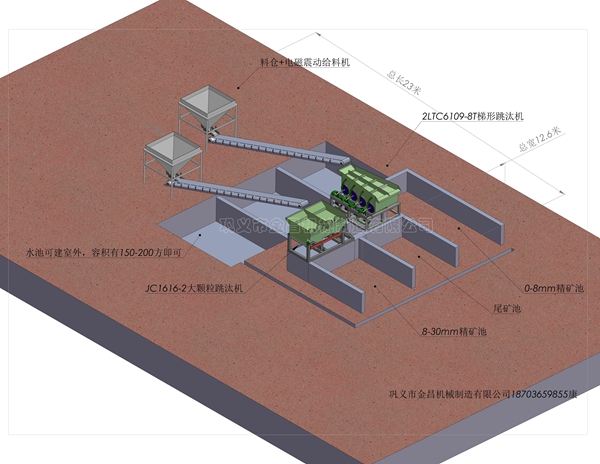 鞏義市金昌機械專業(yè)生產(chǎn)跳汰機設(shè)備,今天為大家介紹兩種常用的跳汰機設(shè)備。一種是2LTC6109-8T梯形跳汰機,一種是JC1616-2大顆粒跳汰機。前者是分選0-8毫米之間的螢石礦,后者是分選8-30毫米之間的螢石礦,單臺每個小時處理量都在20-30噸之間,如果是選其它的礦物,處理量會更大一些。前者是下排料跳汰機,也就是精礦從跳汰機肚子下邊出,后者是篩上排礦的跳汰機,精礦和尾礦都從跳汰機上邊出。兩種跳汰機是黃金搭檔,使用的朋友也比較大,大體怎樣布局您可以參考一下下圖,希望對您有幫助。