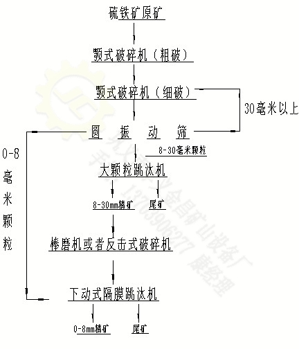 該工藝流程僅適用于要求預(yù)先回收粗粒硫鐵礦的硫鐵礦選礦廠,對于生產(chǎn)硫精砂的企業(yè)則無需如此復(fù)雜的工藝流程,只需經(jīng)過兩次破碎,破碎后的物料直接進(jìn)入棒磨機(jī)或者細(xì)碎機(jī)細(xì)碎后進(jìn)入下動式隔膜跳汰機(jī)分選即可獲得純凈的硫精砂。